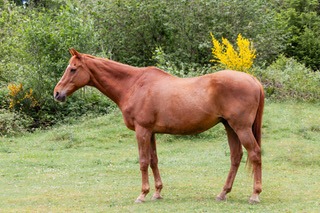 Bam and his buddy, Louie, came to us in March 2017. When they arrived they were thin and had messy feet. We were pleased to realize that he is an easy keeper and has nice feet. He is ridden barefoot and does well. He is 16-2 hands and big bodied, born in 1997. He is a very nice horse to be around; quiet for the vet, hoof trims and everything else.